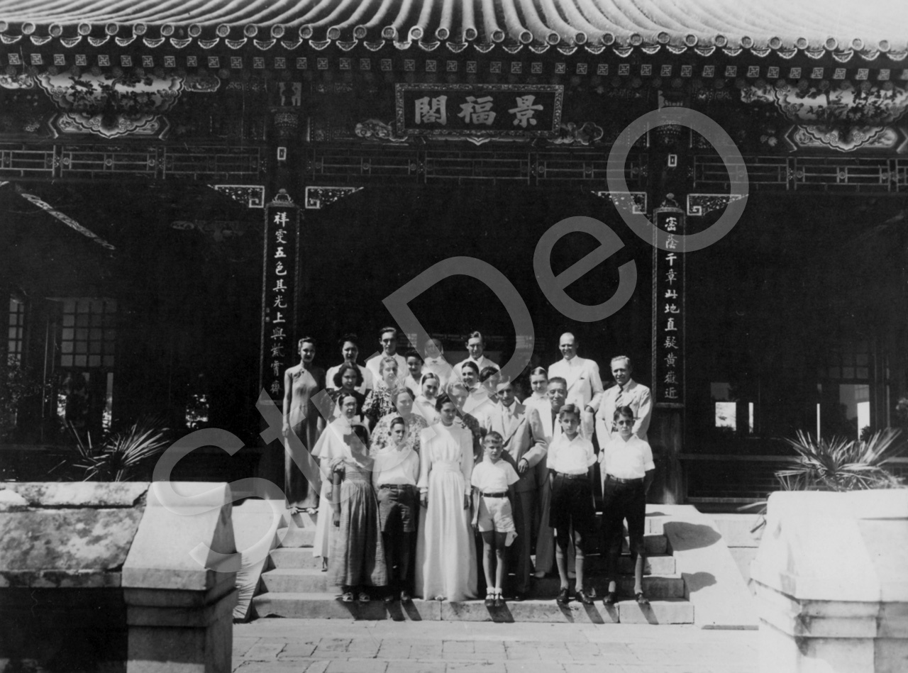 Beschreibung: Am Eingang eines Gebäudes im Sommerpalast posiert die Gesellschaft zur Feier der Konfirmation von Billa Wang und von Jürgen und Peter Stick­forth. Anwesend sind ferner: Schw. Julchen Schuler, Suse Wang, Ober­schw. Anna Schönleber, John Stickforth, Linde Wang, Liane Wang, Schw. Christine Ottmar, Ruth Wang, geb. Kettner, Helene Stickforth, Schw. Au­gust Ernst, Didi Wang, Claus Stickforth, Schw. Helene Bayha, Pastor Hel­mut Lehmann, Wang Yin-tai, Dr. Kurt Stickforth.