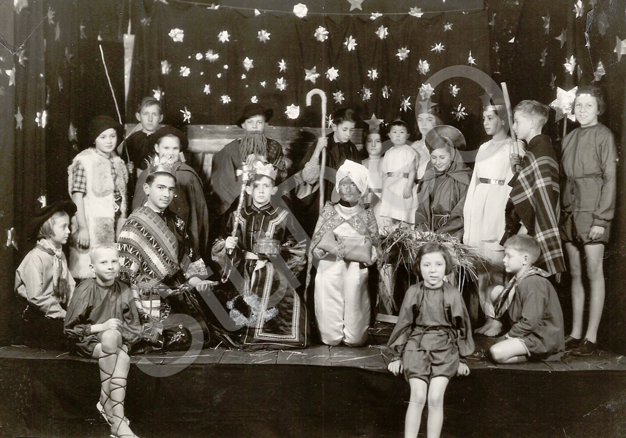 Beschreibung: Schulkinder der dt. Schule Peking bei der Aufführung. Krippenspiel, Re­gie Renata Steenken. v.l.nr. Tania, Wilhelm Haas, Liane Wang, ?, Hedi Ruck (Hirte in 2. R.), Dimitri Bouhoutsos, Günther Rothe ? (Bart), ? Stickforth (Krone), Hirte ?, Page ?, Doris Severitt (Stern), Chinese, hinten Muschi Harpfinger, Lilo Wilfert (Maria), ?, ? (karierte Decke), Mimi Clemann, Marthali vorne sitzend, ?.