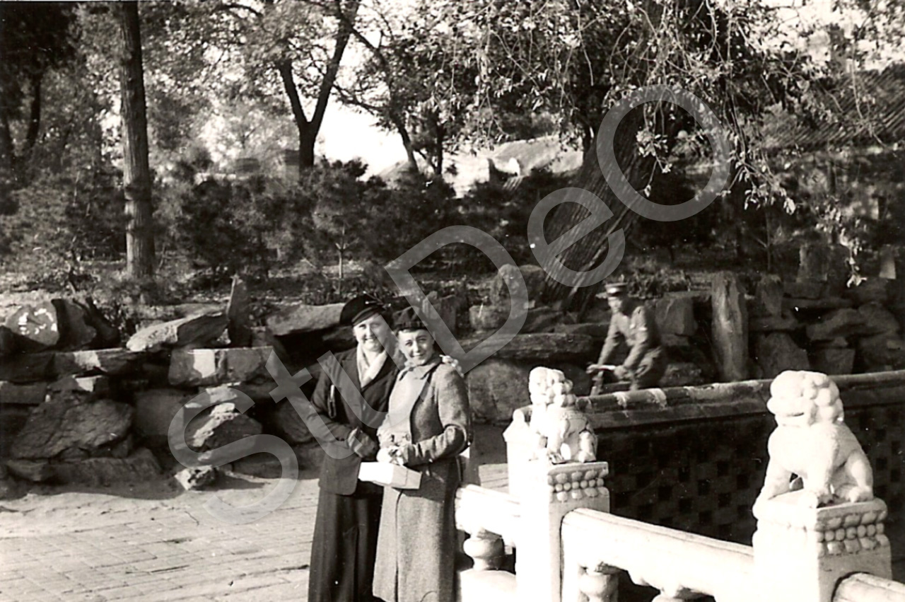Beschreibung: In einem Park, li Marianne Lemmer, Renata Steenken. Chin. Polizist auf Fahrrad.