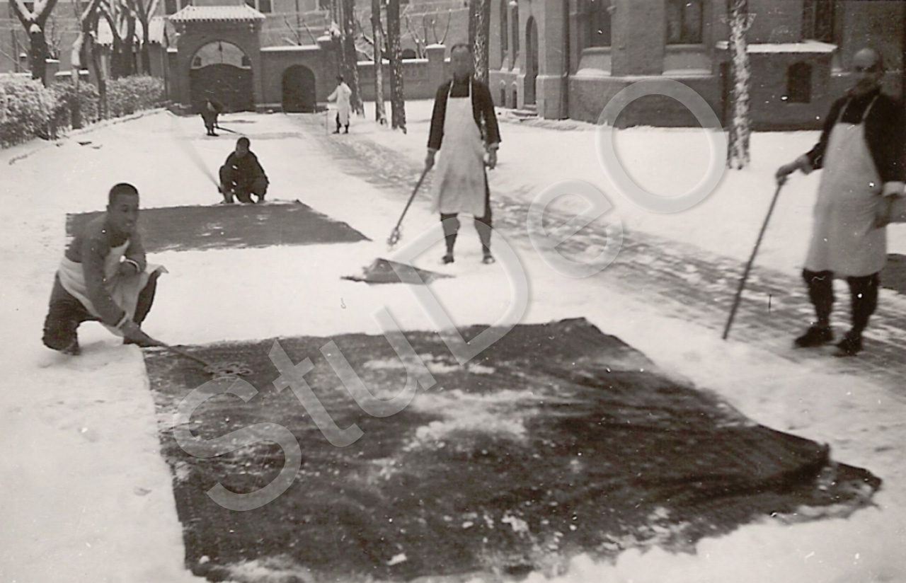 Beschreibung: Im Lehrercompound, hinten Ausgang zur Legation Street, Chinesen klopfen Teppiche auf dem Schnee, „der in Peking selten fällt und  bei der trocknen Luft und Sonnenschein schnell verdunstet“
