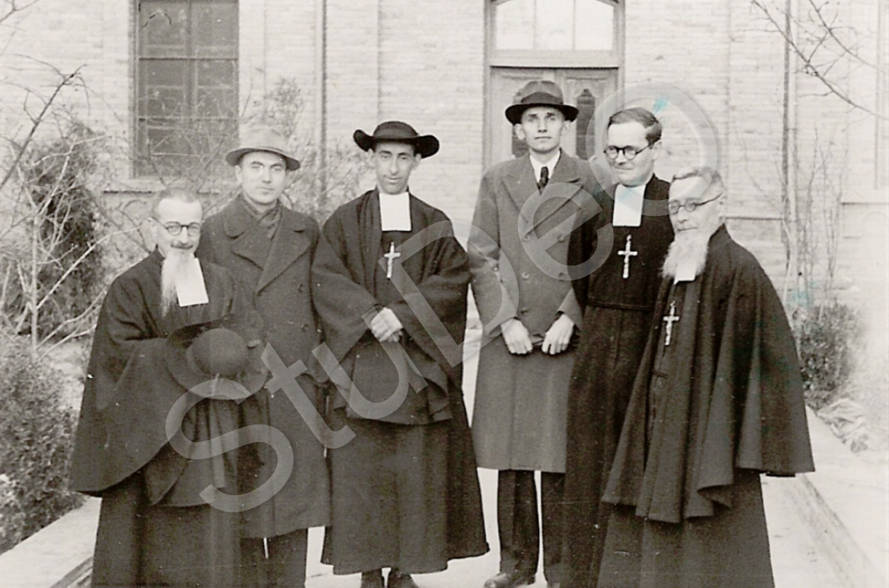 Beschreibung: Besuch im Kloster Chala außerhalb von Peking. Dr. Gottfried Weiß 2. v li., Pastor Hellmut Lehmann (groß). 2 französische, 1 spanischer und 1 elsässischer Padres. „Das Kloster stellte europäische Spirituosen in betrechtlicher Menge her, aus Trauben Nordchinas“.