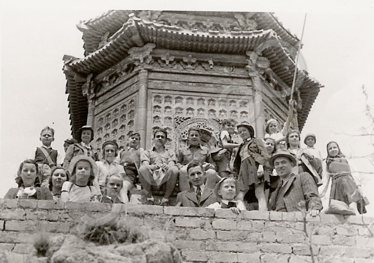 Beschreibung: Schülerausflug zum Sommerpalast. Hier stehen sie an der Porzellan- bzw. Majolika Pagode (Huazang).v.li. Doris Severitt, 2. Friedel Heiss, 3 Lilo Wilfert, 4 Eva Dello, 5 Irmchen Marschall, 6 Tania Romanovsky, 7 Irina Rebrin, 8,?, Dimitri Buhutzo, 10 Dieter Theile, 11 Pasottor Lehmann, 12 Felix Heinike, 13, Wilhelm Haas, 14 Ursel Marschall, 15  Mimi Clemann, 16. Jörn Anner, 17 Lehrer: Dr. Gottfried Weiß, 18 Muschi Harpfinger, 19 Erika Rothe, 20 Rosi Clemann.