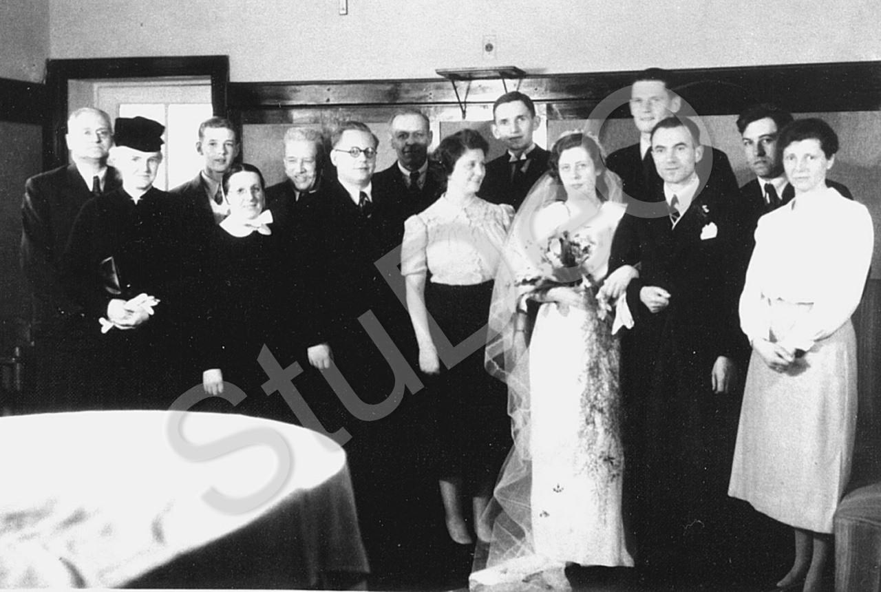 Beschreibung: Hochzeitsgesellschaft von Dr. Gottfried und Annelore Weiß im Nordhotel Peking V.l.n.r. René und Edna-Anna Dammron, Max Kupka, Schwester Julie Schuler, Musikprof. Richard Kupka (Harmonium), Walter Genthner (Hobbysänger, sang bei der kirchlichen Trauung „All mein Gedanken, die ich hab, sind bei dir“), Dr. med. Kurt Stickforth, Gertrud Eckert (ihr Mann, Dr. med. Erwin Eckert, war zu einem Patienten gerufen worden), Pastor Hellmut Lehmann, Annelore Weiß-Joanni, Hans Wechsel, Dr. Gottfried Weiß (Leiter der deutschen Schule Peking), Herr Hudowsky, Helene Stickforth.
