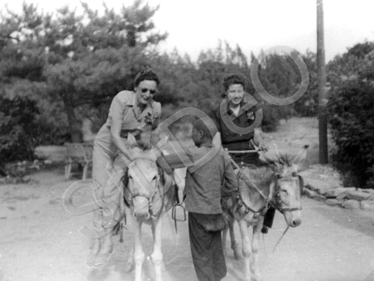 Beschreibung: Eselreiten in den Westbergen von Peking bei der Hochzeitsreise der Emmes Anfang Oktober 1941. Elvira Emme (rechts) und Frau Boujanovski.