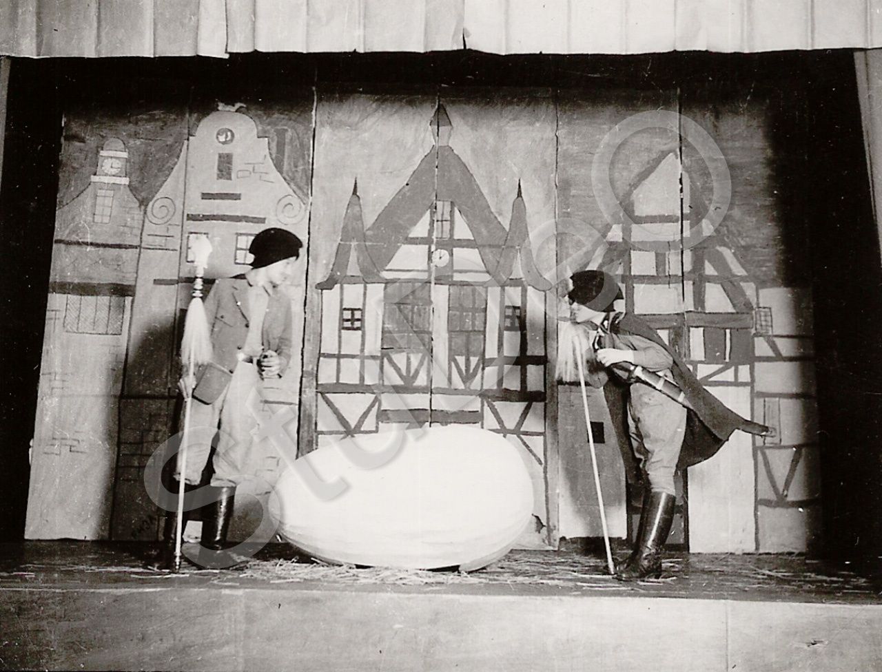 Beschreibung: Weihnachtsspiel „Das große Ei“ der Deutschen Schule. Theater­auf­führung, Carl Friedrich und Friedl Heiss (Schildwach) bewachen das Ei.