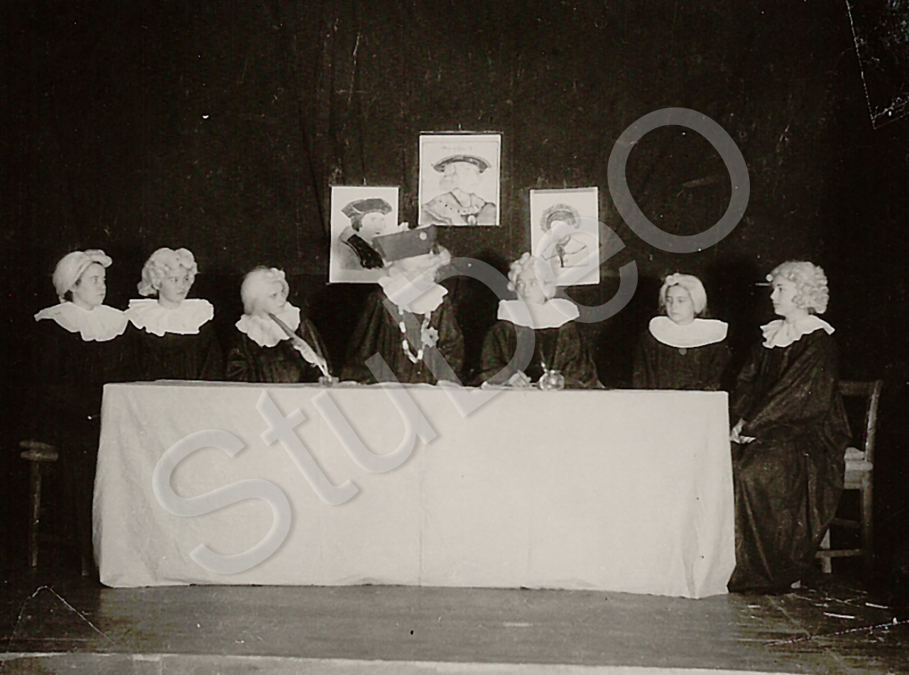 Beschreibung: Weihnachts-Schulfest „Das große Ei“ der Deutschen Gemeinde. Theater­aufführung, Die Ratsherren v.l.n.r. Doris Severitt, Liane Wang, Ruth Böhler, Jörn Anner, Wolter v. Stael-Holstein, Luise Olthafer, Tania Romanovsky.