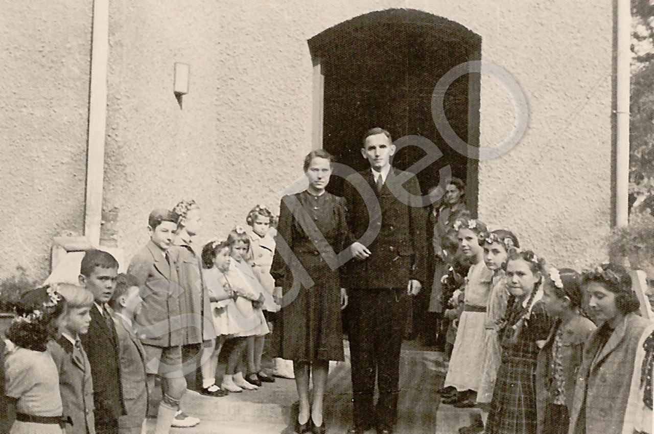 Beschreibung: Am Eingang der Dt. ev. Kirche. Emily Hundertmarck, Missionarin der Berliner Mission, vorher bei Can­ton, heiratet Pastor Hel­muth Heinrich Leh­mann. E. Hundertmarck kam wegen Kriegswirren im Südchina nach Peking. v.li. Käthe Olthafer, Düde Wilm, Günther Spengler, Alfred Wessel, Lino Mina, Helga Prüfer, Sieglinde Maeker, Helga Dello, ?, das Brautpaar, ?,?, Marianne Jährling, Brigitte Rüdorff, Hedi Ruck, Marthe Clemann, Sonja Taschdjian, Tania Romanovsky.