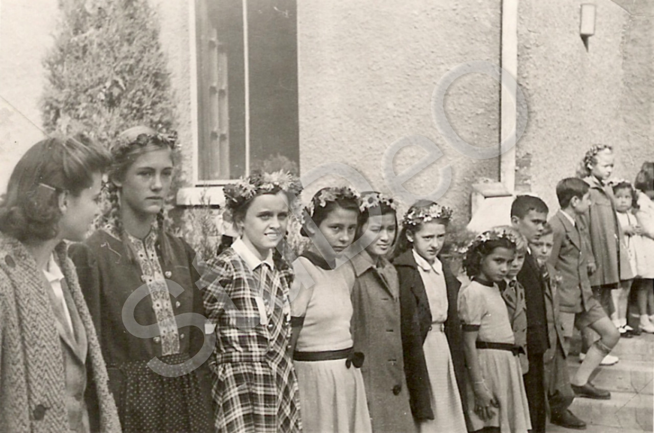 Beschreibung: Schüler der dt. Schule Peking säumen am Eingang der Dt. ev. Kirche das aus der Kirche kommende (nicht im Bild) Hochzeitspaar. Emily Marie Hundertmarck, Missionarin der Berliner Mission aus Can­ton, und Pastor Hel­muth Heinrich Leh­mann. E. Hundertmark kam wegen Kriegswirren im Süden Chinas nach Peking. v.li. Marianna Bokemüller, Anneli Wilm, Ruth Böhler, Luise Olthafer, Liane Wang, Mania v. Stael-Holstein, Käthe Olthafer, Heinrich (Düde) Wilm, Günther Spengler, Alfred Wessel, Lino Mina, Helga Prüfer, Linde Maeker.