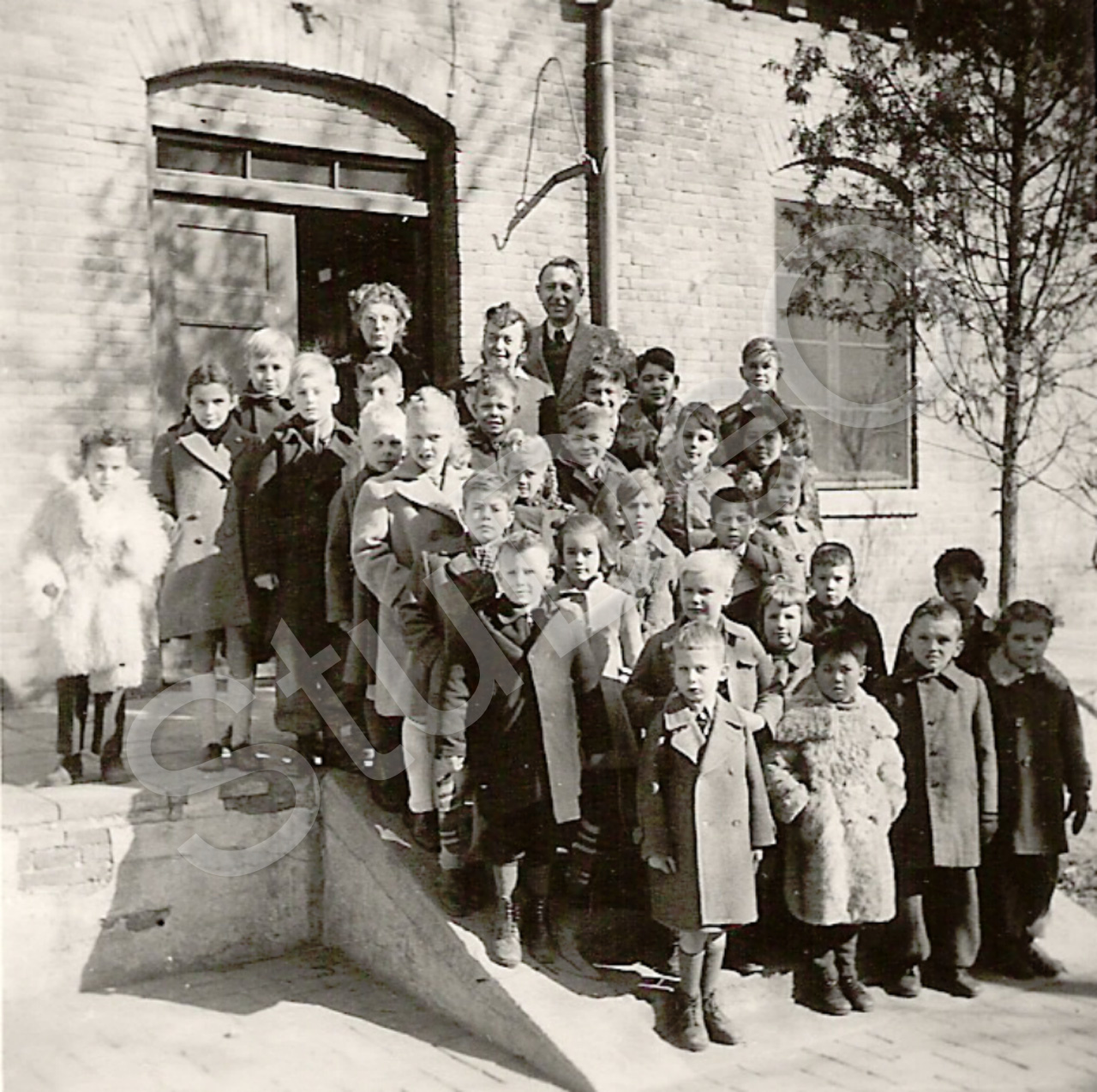 Beschreibung: Schüler der Grundschulklassen der Dt. Schule am Eingang der ev. Kirche (ehem. Militärbaracke), Schuljahr 1944/45. Vorne v.l.n.r. Gottfried Haas, Wilhelm Schmidt (kleiner Bruder von Fritz), Christa Marschall,. Italiener, Helga Dello, Günter Secker, Helga Prüfer, Hans Bechtle, Rudolf Heinicke (kleiner Bruder v. Felix), Eberhard Haas, Heinrich (Düde) Wilm, Lehrerin Renate Steenken, Hilfs­lehrer Wessel (Heilsarmee), Ute Sterz, Käthe Olthafer, Fritz Schmidt (Vater aus Batavia, an Botschaft in Peking, später an Botschaft in Amsterdam), Elfriede Rösing.