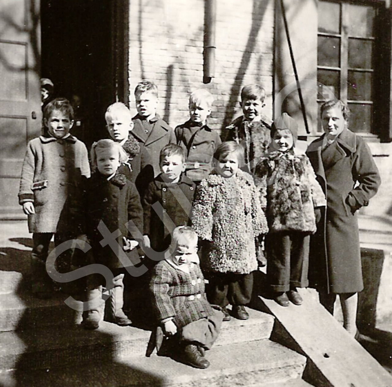 Beschreibung: Kindergarten der Dt. Schule am Eingang der ev. Kirche (ehem. Militär­ba­racke). Vorne sitzend ?, stehend Christa Marschall ?, Siegfried Maeker ?, Karin Sanner (Pelz), Inge Petzschke ?, Kindergärtnerin Walther, hinten links: Sieglinde Maeker ?, Eberhard Haas, Rudolf Jährling, ? Löhr ??, Wolfgang Sanner.