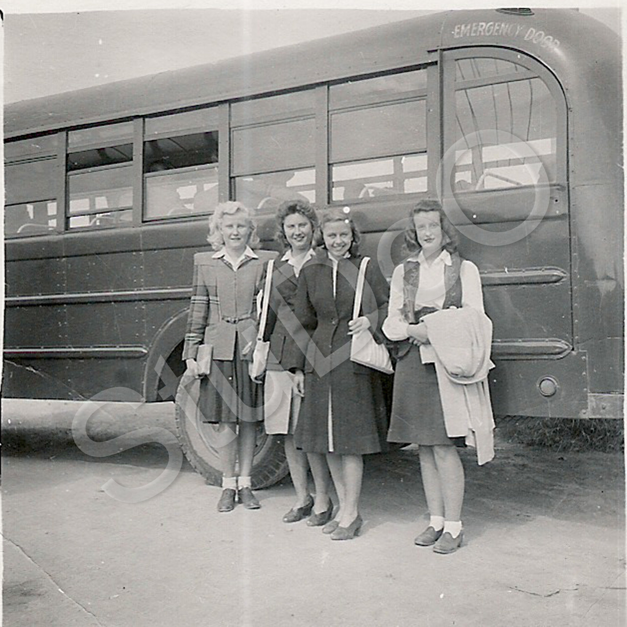 Beschreibung: Christl Skoff, Lilo Wilfert, Irina Rebrin, Irmchen Marschall „unserere Crew am Flughafen navy Supply“ vor einem Bus der Amerikaner. Sie fanden Arbeit bei der US-Army im navy supply am Flughafen.