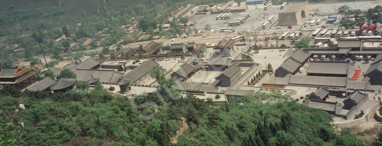 Beschreibung: Park- und Häuseranlage für Besucher der Großen Mauer, aufgenom­men von der Mauer aus. Eine 3-spurige Autobahn verbindet diese Anlage mit Peking.