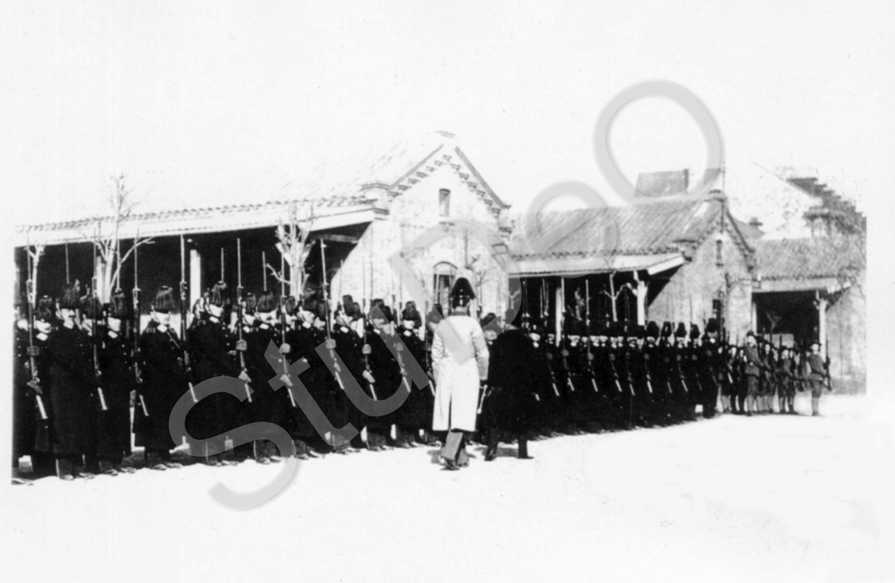 Beschreibung: Soldaten und Jugendwehr stehen vor den östlichen Militärbaracken zum Empfang eines Besuches? In diese Baracken wurden später die Dt. Schule, Kinder­garten und evangelische Kapelle untergebracht.