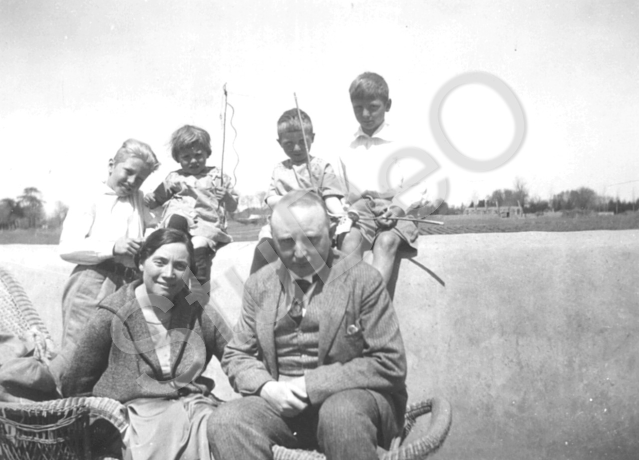 Beschreibung: Karl August und Marie Balser mit ihren 4 Kindern v.li.n.re.: Karl August, Johannes, Christian und Helmut im Frühjahr an der Lehmgartenmauer in Paomachang.