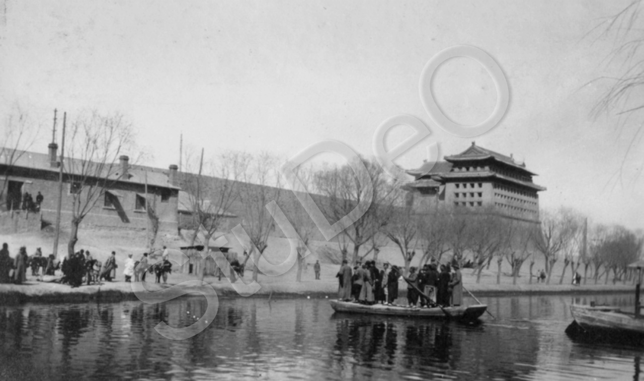 Beschreibung: Blick auf einen Eckturm der Verbotenen Stand vom Bei Hai aus. Fähre. Esel. Menschentreiben. Winter.