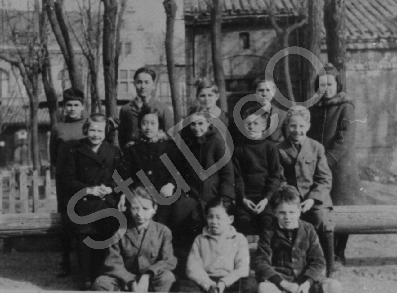 Beschreibung: Vorne sitzend v.l.n.r.: Helmut Balser, Georg Ce (Palta), ?; 2. Reihe Gre­tel Reizig, Mimi Sun, Dora Cordes, Russe, Karl-August Balser; Hinten Friedrich Cordes, Eugen Newel, Karli Ettinger, Russe, Hilde Jährling. Im Hintergrund die Deutsch Asiatische Bank.