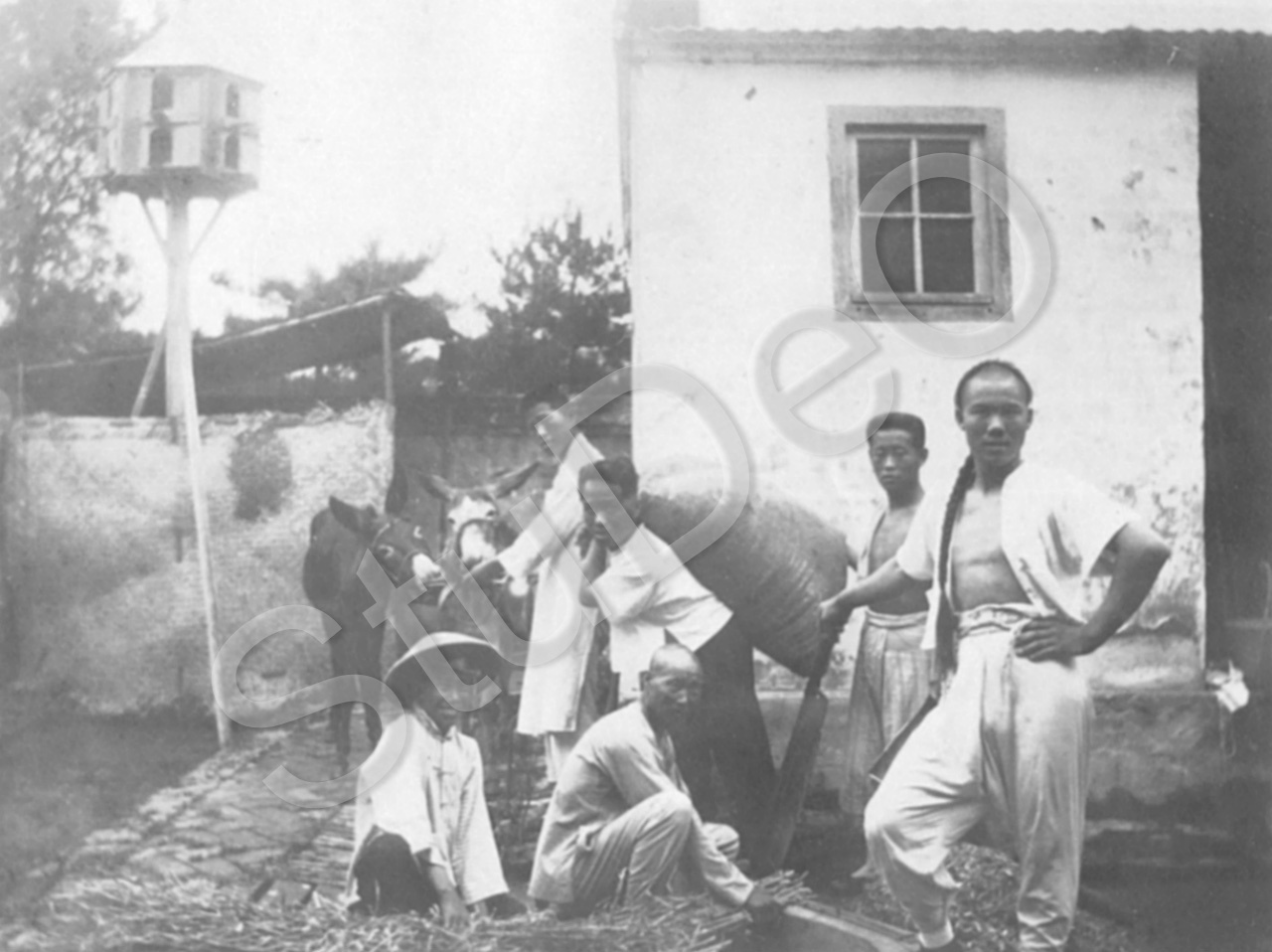 Beschreibung: Bei der Arbeit, Äste zerkleinern. Esel zum Säcketransport.