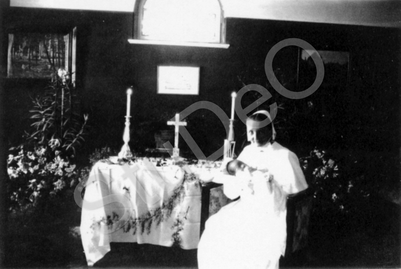 Beschreibung: Schwester Fanny Kubler mit Täufling. Taufe von Claus Stickforth im „gemütlichen Zimmer“ neben dem Schwesternspeisesaal.