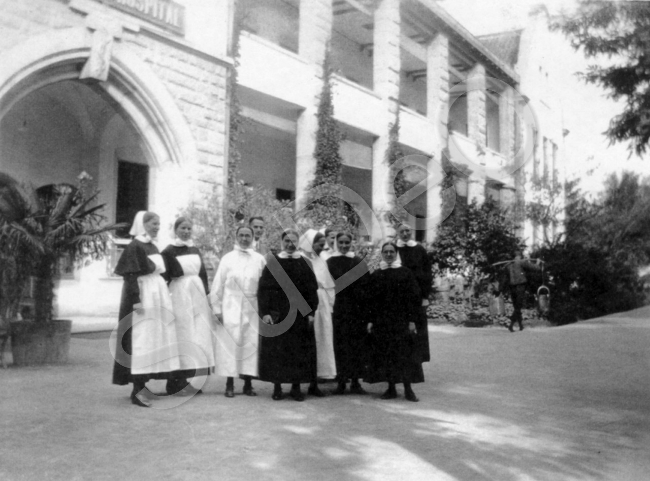 Beschreibung: Vor der Front des Deutschen Hospitals, V.l.n.r. Schw. Fanny Kübler, Ba­bette Kochendörfer, Sophie Illg, ?, Oberschw. Anna Schönleber, Auguste Ernst, Margarete Ziegler, Julie Schuler.