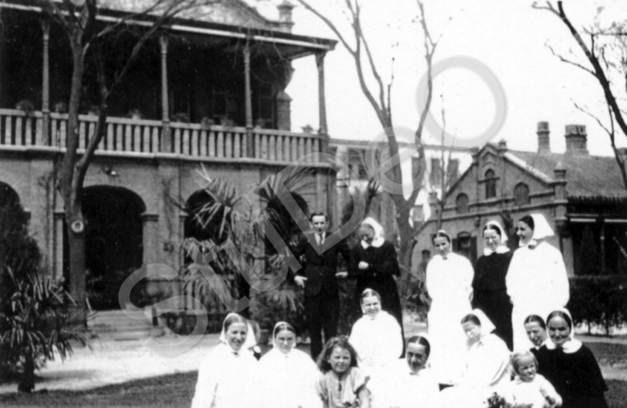 Beschreibung: Pastor Hellmut Lehmann mit Schwestern des Deutshen Hospitals Peking vor dem Schwesternhaus, rechts das Pfarrhaus.