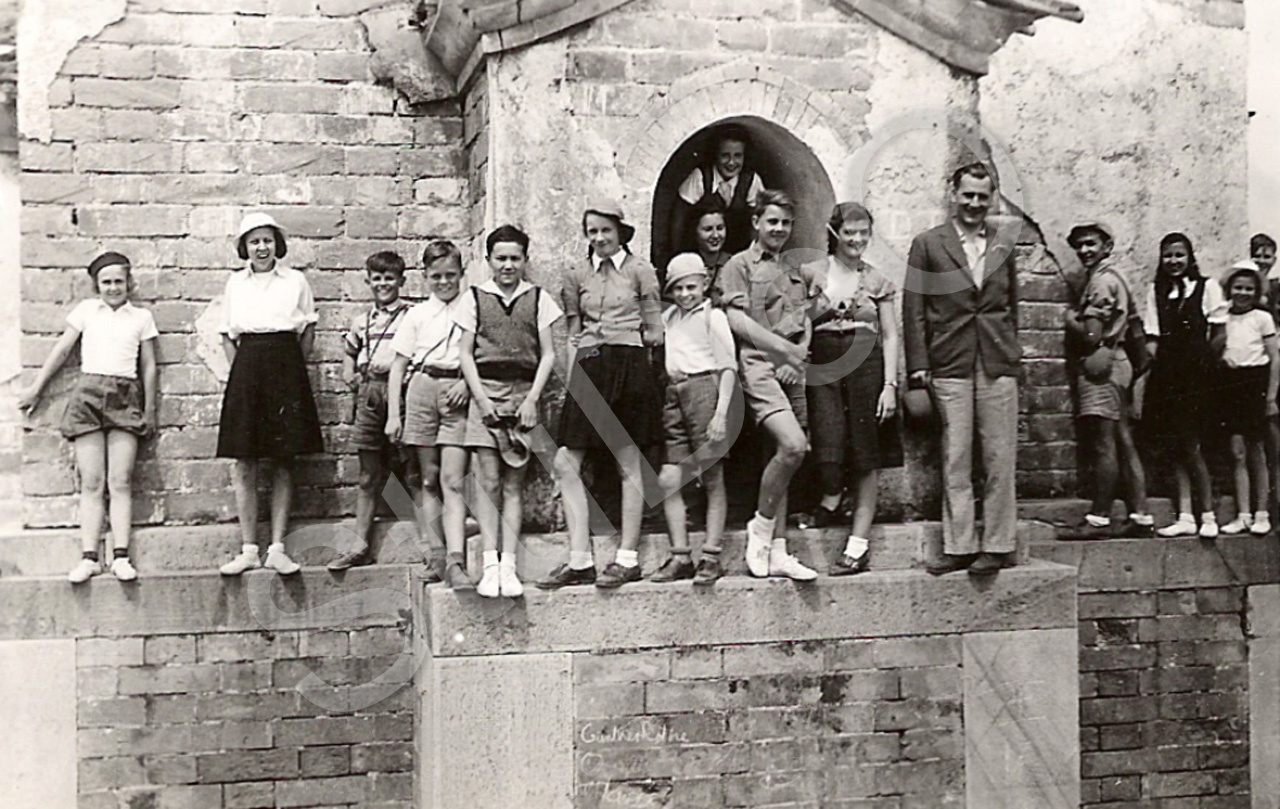 Beschreibung: HJ-Ausflug zur Jadequelle, auf Sockel einer Pagode stehend. v.li. Tania Romanovski, Mimi Clemann, Günther Rothe, Friedl Heiss, Felix Heinicke, Ursel Marschall, Jörn Anner, Nische: Lilo Wilfert, dahinter Irmchen Marschall. Vor Nische: Dieter Theile, Muschi Harpfinger, Gustav Steenken, Dimitri Bouhoutsos, Rosi Clemann, Eva Dello (weiße Bluse), ?. Beachten: Kritzelei auf Sockel von Günther Rothe u.a.