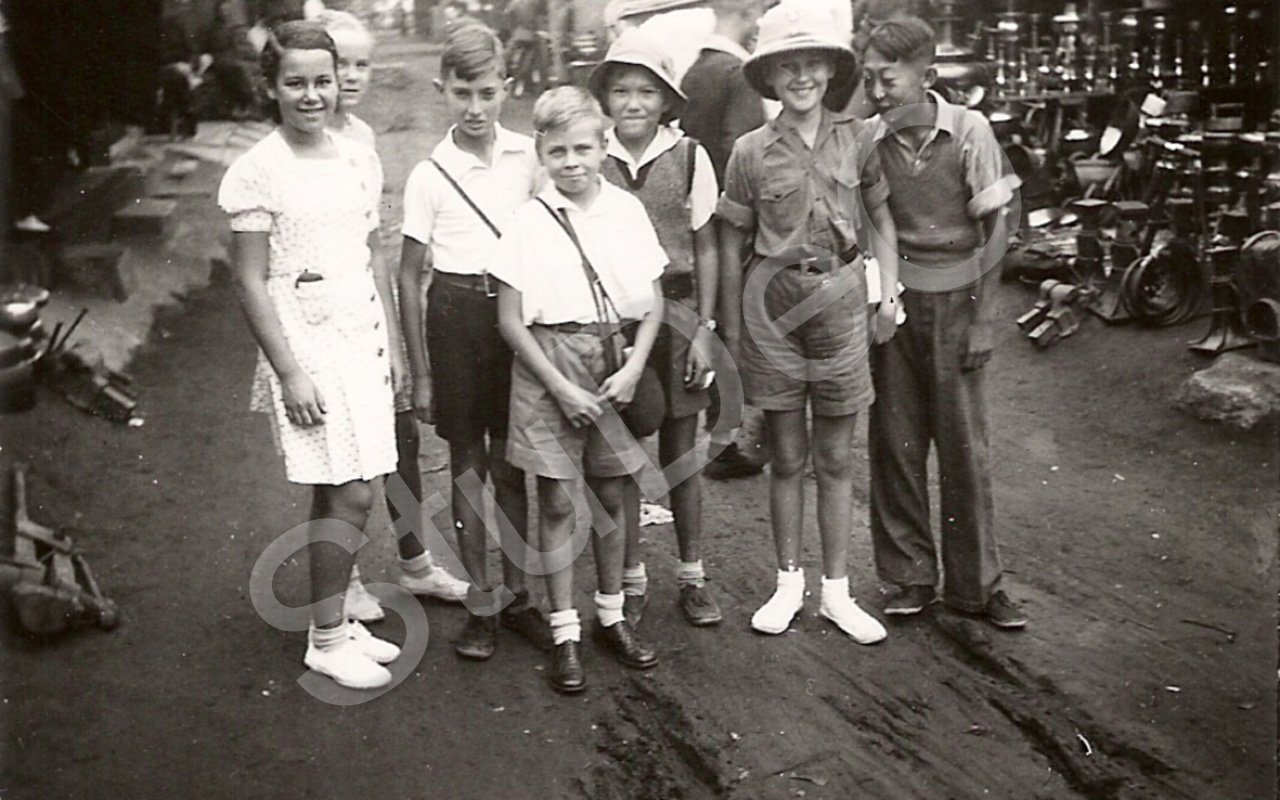 Beschreibung: Schulkinder auf Sandstraße, rechts Fahrradreparaturstelle. V.li. Doris Severitt, Irina Rebrin (hinten), ? Stickforth, Jörn Anner, Felix Heinicke, Sergei Soldatenkoff, Chinese.