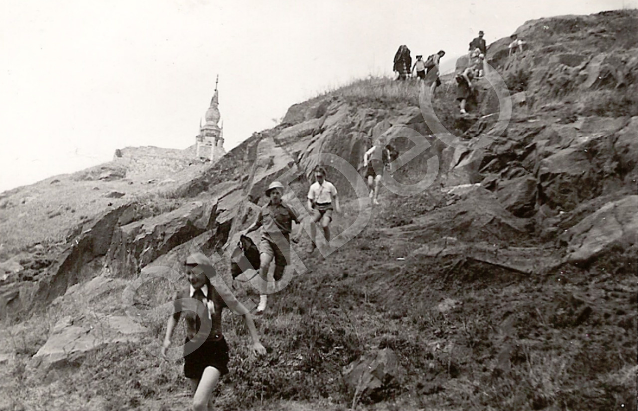 Beschreibung: Ausflug Gustav Steenken (nicht im Bild) mit seinen Schülern in der Um­ge­bung des alten Sommerpalastes? Im Hintergrund eine Ruine einer ba­ro­cken Pagode?.