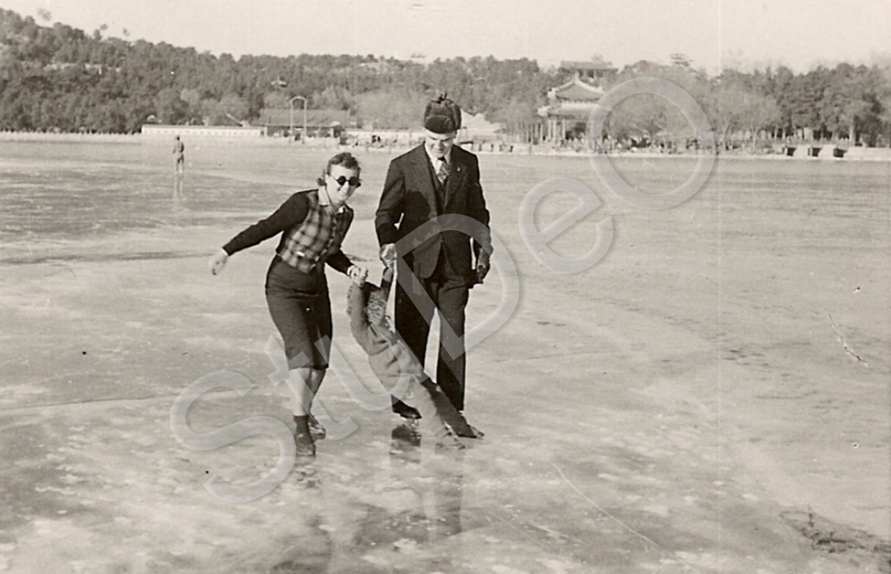 Beschreibung: Renate Steenken und Herr Spengler (Konsulatsbeamter der Dt. Botschaft) mit Tochter auf dem zugefrorenen See im Sommerpalast.