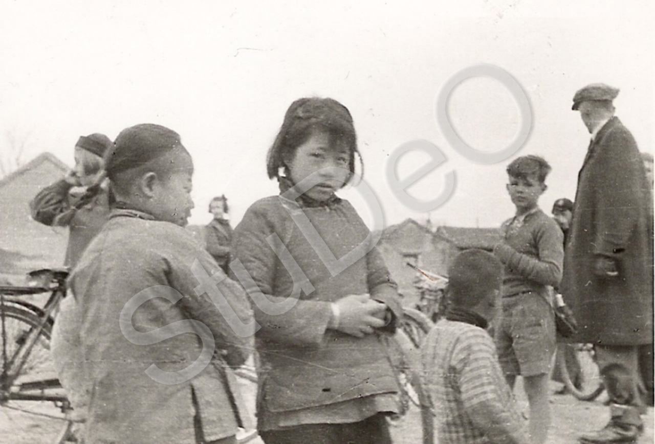 Beschreibung: Schüler auf Radtour, treffen Chinesenkinder. Ganz rechts ein Lehrer.
