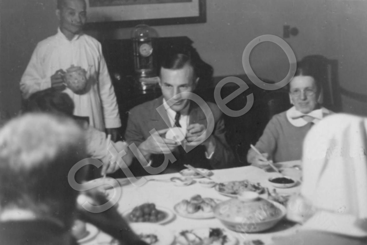 Beschreibung: Prof. Günther Huwer beim chinesisch Essen mit den Schwestern, Schwes­ter Julchen, die die Verwaltung im  Deut­schen Hospital Peking inne hat,  Chinesischer Diener serviert Tee.