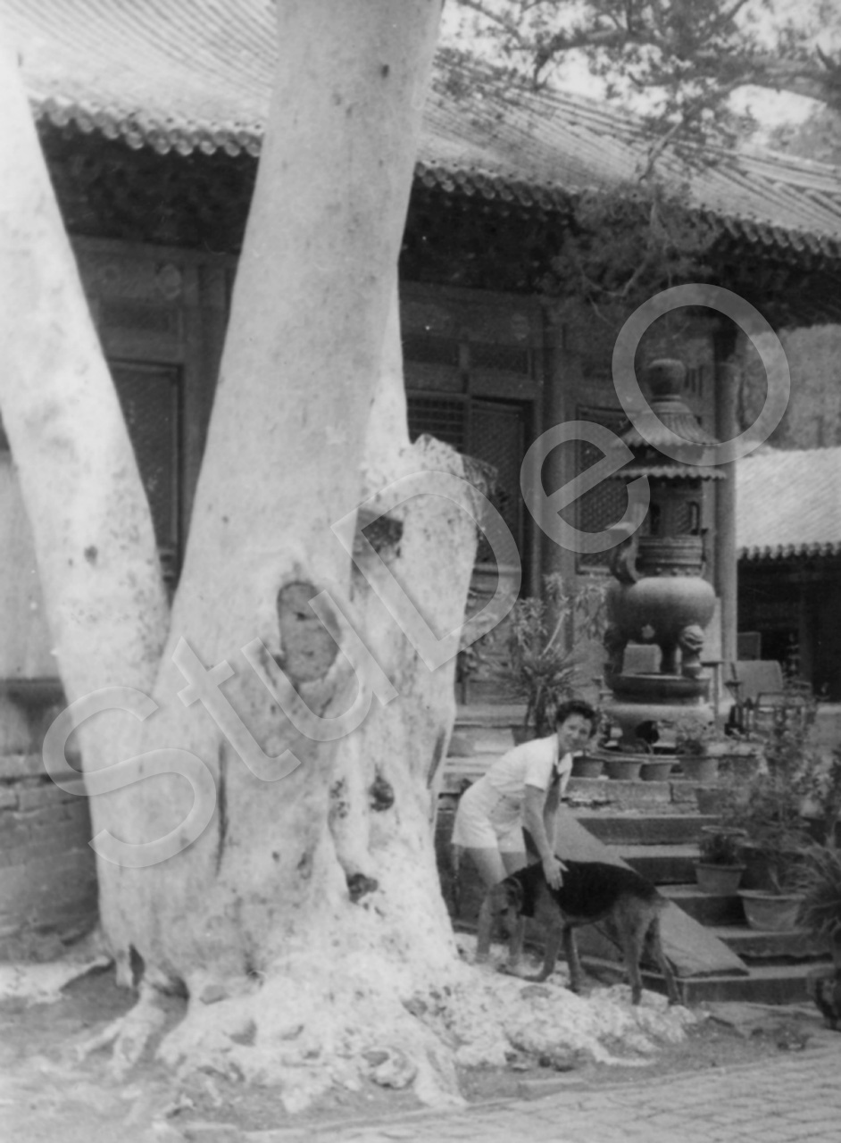 Beschreibung: Emilie Thürmer und Hund Kelef Bei einem Tempel mit einer Weißstamm-Kiefer.