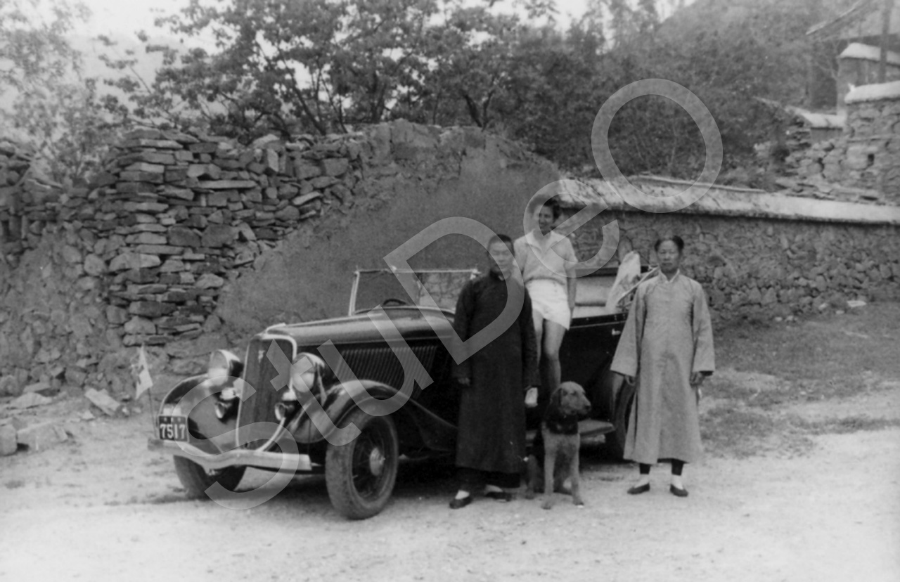 Beschreibung: Mit dem Auto zum Black Dragon Pool. Emilie Thürmer, chinesischer Chauffeur und Amah.