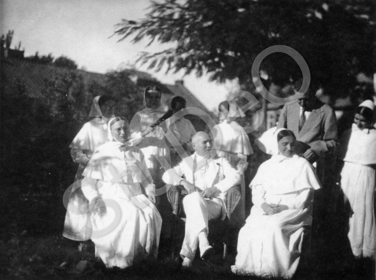 Beschreibung: Schwestern des Dt. Hospitals Peking mit Sanitätsrat Dr. Dipper (sitzend) und Dr. Kurt Stickforth, vorne links Oberschw. Anna Schönleber.