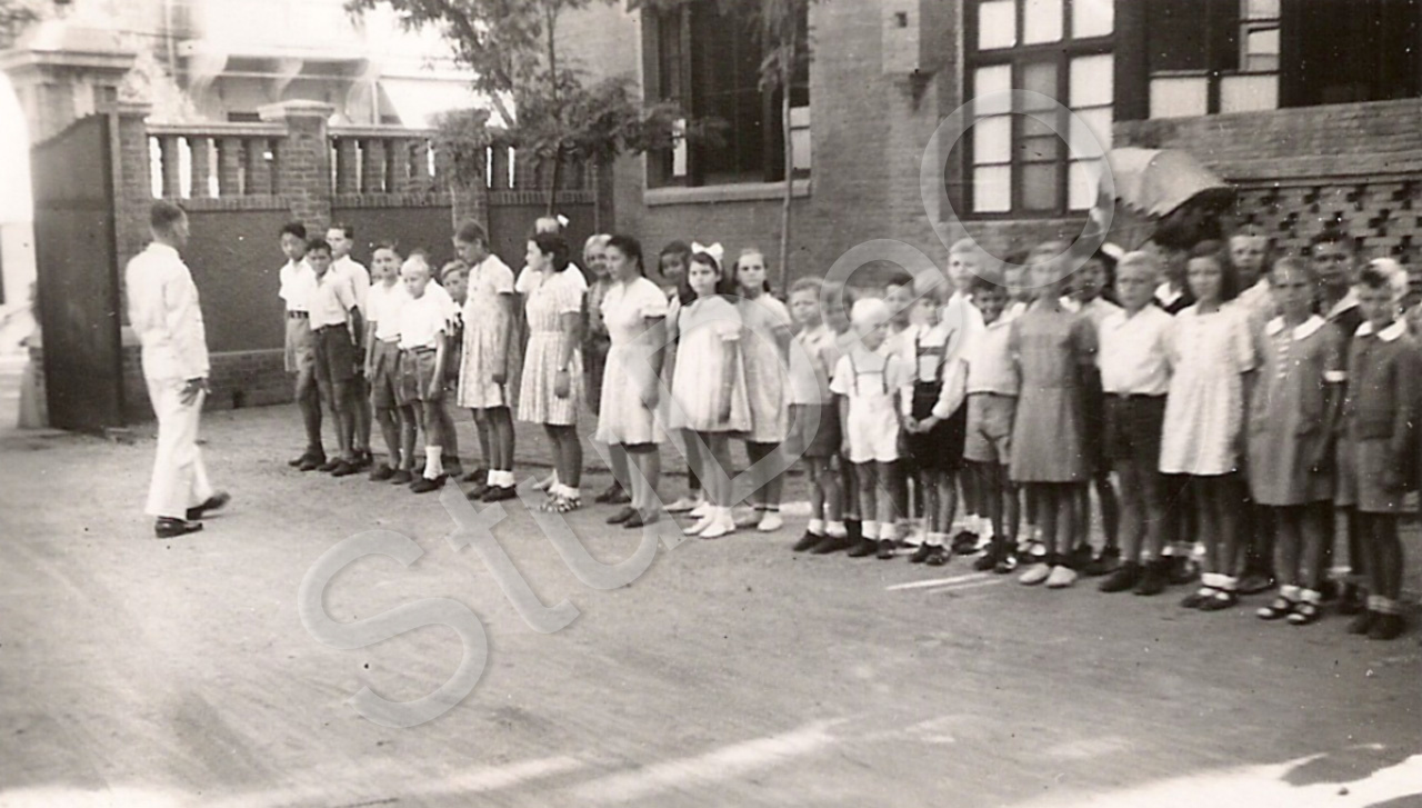 Beschreibung: Schülergruppe links vom Eingang zum Schulgelände im Hof. Lehrer Gustav Steenken. v.li. ?, Boris Sawialoff (hinten), Felix Heinicke, Wolter v. Stael-Holstein, Wilhelm Haas, Heinrich Jährling (klein), Anneli Wilm, Irmchen Marschall (mit Haarschleife), Doris Severiit, Tania Romanovski, Sonja Tashjan, Liane Wang, Erika Trautmann, Hedi Ruck; Hans Bechtle, Wilhelm Schmidt (hinten), Eberhard Haas (strohblond), Italiener (hinten), Heinrich (Düde) Wilm, Fritz Schmidt, Heinricht Heinicke, Brigitte Rüdorff (halb verdeckt), Juliane Brüll, Heini Wu, Alex Romanovski, ?, Marthali Clemann, Eva Dello, Marianne Jährling (rot-weißes Kleid), Günther Spengler (hinten), Alfred Wessel.