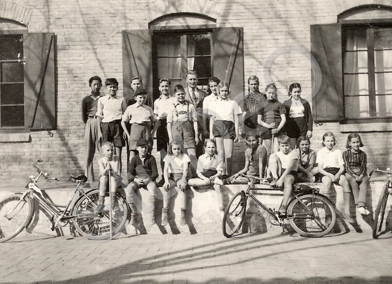 Beschreibung: Gustav Steenken mit Schülern der Dt. Schule Peking. Unter den Schülern: vlnr 1. Reihe vorne: Wilhelm Haas, Heinrich Jährling, Erika Rothe, Marianne Jährling, Luise Olthafer, Alex Romanovsky, Ruth Böhler, Eva Dello, Juline Brüll. Mitte stehend: Felix Heinicke, Jörn Anner, Friedl Heiss, Tania Romanovsky, Adelinde (Adi) Jess, Doris Severitt. Hinten stehend: ?, Sergei Soldatenkoff, Carl Friedrich, Gustav Steenken, Irmchen Marschall, Annelie Wilm.