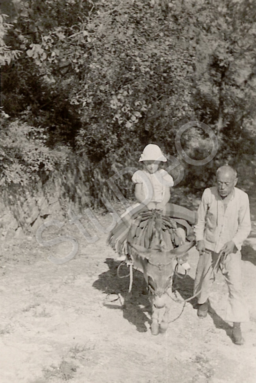 Beschreibung: Ute Sterz auf einem Esel, Mafu (Pferdeknecht).