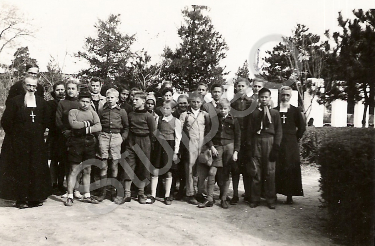 Beschreibung: Schülergruppe, Gustav Steenken und Gustav Steenken zu Besuch im Kloster Chala außerhalb Pekings.Padres der Mission sind auch im Bild.