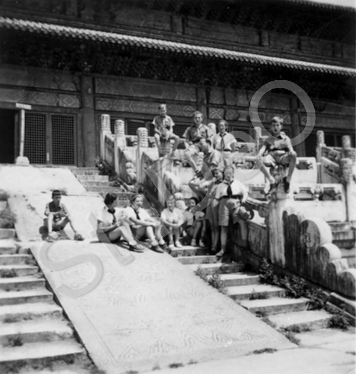 Beschreibung: HJ-Ausflug zu Tempeln in oder um Peking. Auf der Treppe sitzend: Clau­dia Brann, Lola Parge, Muschi Harpfinger, Ursi Marschall. Auf Brücken­pfosten Jürgen Stickfort.
