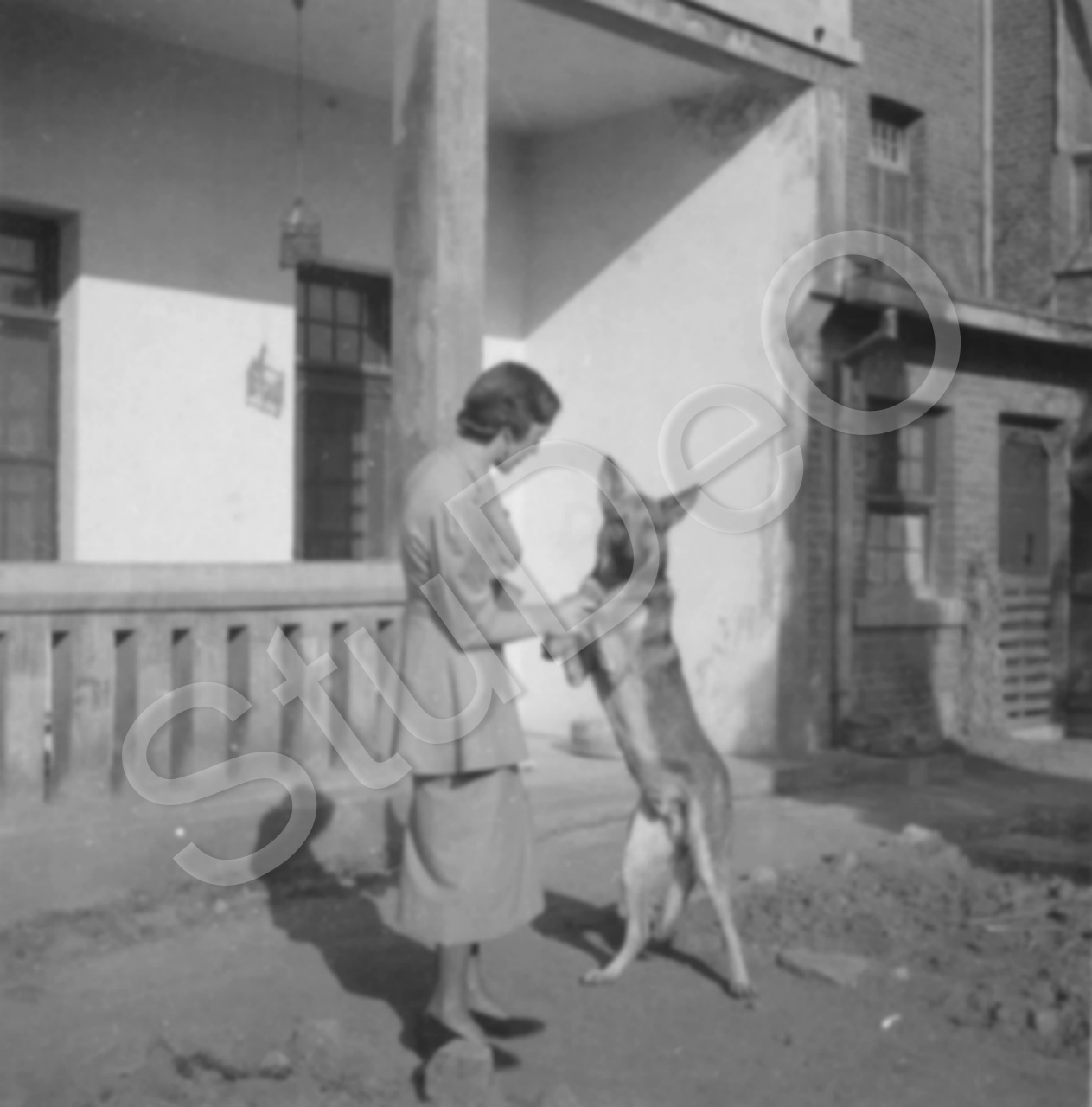 Beschreibung: Elfriede Musshoff mit Hund Kuno im Gaten des Hauses in Tsinanfu.