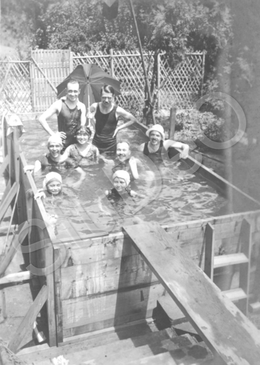 Beschreibung: Stehend v.l. Kunz, ?. Im Wasser v.l. Otto Hauer Fr. Hora, Staak, Otte im Holz-Schwimmbecken „Marmorbad ‚Ostende’“.
