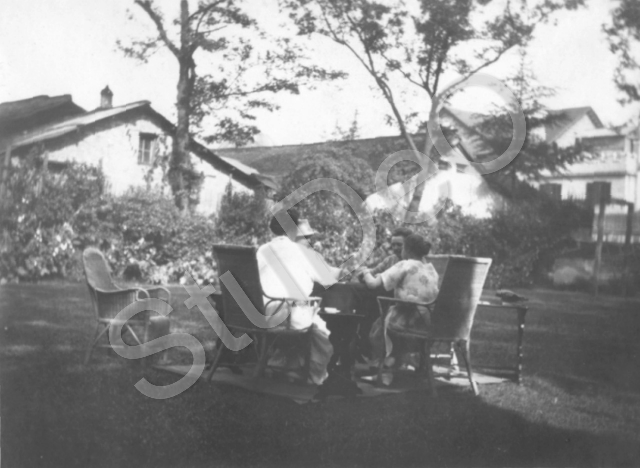 Beschreibung: Helene Gerngroß spielt mit Damen Mah-Jongg im Garten des Hauses in der 49 Sinza Road.