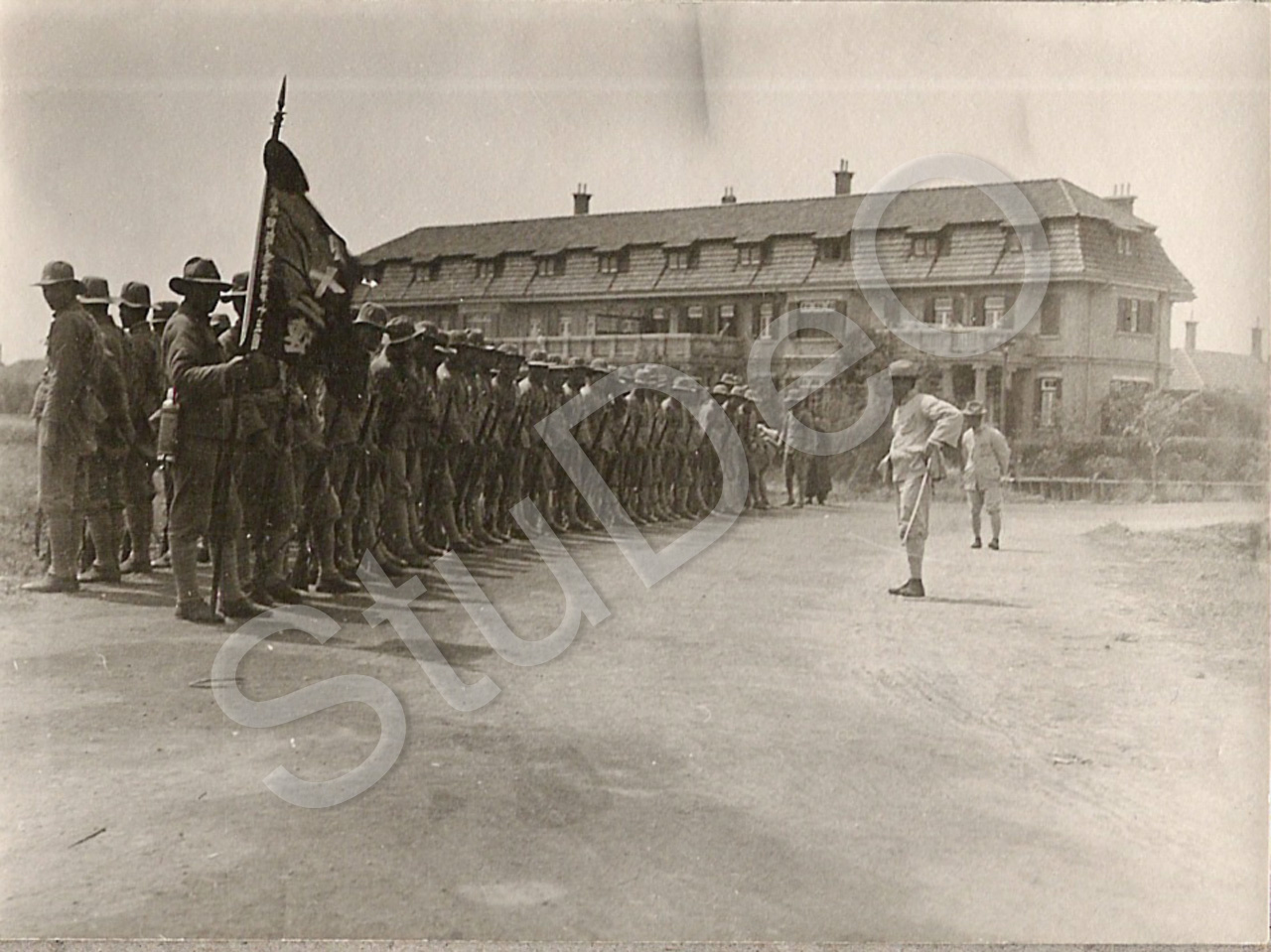 Beschreibung: „Aufmarsch der Truppen vor der Tungji Universität zum hinauswerfen der 20 unliebsamen Studenten“. Chinesische Soldaten.