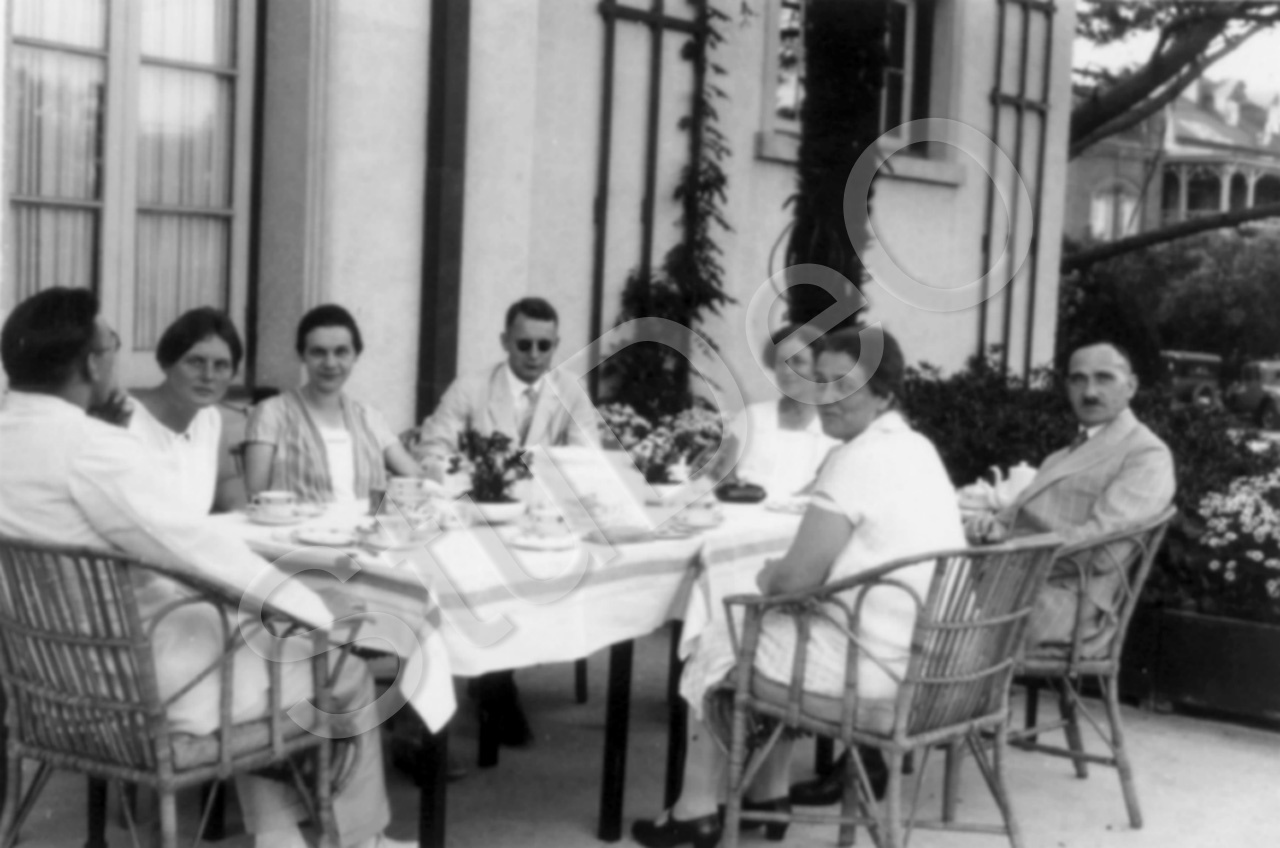 Beschreibung: Lehrerkollegium der Dt. Kaiser Wilhelm Schule beim Kaffee auf einer Terrasse. v.l.n.r.: Fritz Kuck, Ilse Jordan, Frau Krüger, Dr. Dietrich Weber (Schuldirektor nach A. Hellwig ab 1929), Bertha Trumpf, Frau Simon  (vorne) u. Adolf Hellwig.