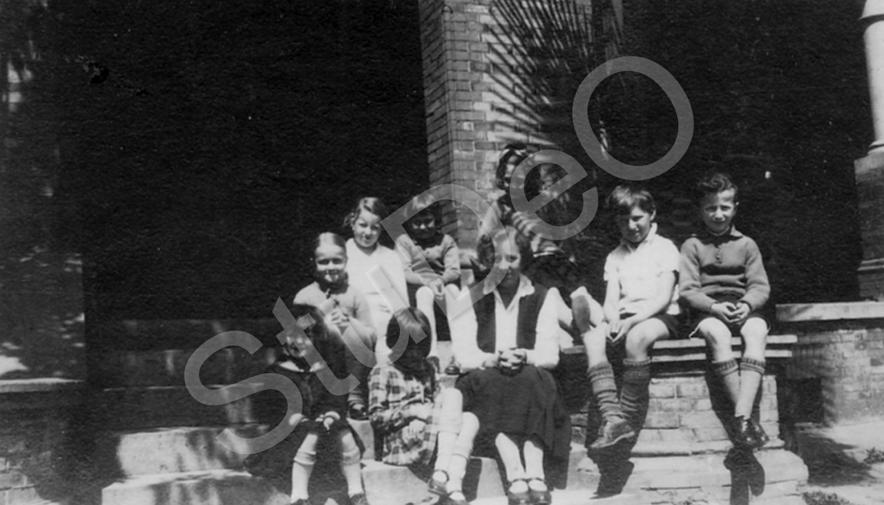 Beschreibung: Bertha Trumpf  mit den Erstklässern am Schuleingang der Kaiser Wilhelm Schule Shanghai im vorläufigen Gebäude in der Jessfield Road. Inge Breuer, Wera Siemssen, Nina Melbardt, Harry Sterelny, Anna Widmann, Bertha Trumpf, Peter Komor.