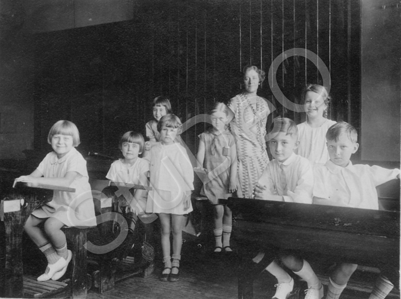 Beschreibung: 2. Klasse der Kaiser-Wilhelm-Schule im neuen Gebäude in der Great Western Road. Erika Phillip, Irene Möller, Inge Breuer, Wera Siemssen, Nina Melbardt, Bertha Trumpf, Jochen Rogge, Anna Widmann, Harry Sterelny.