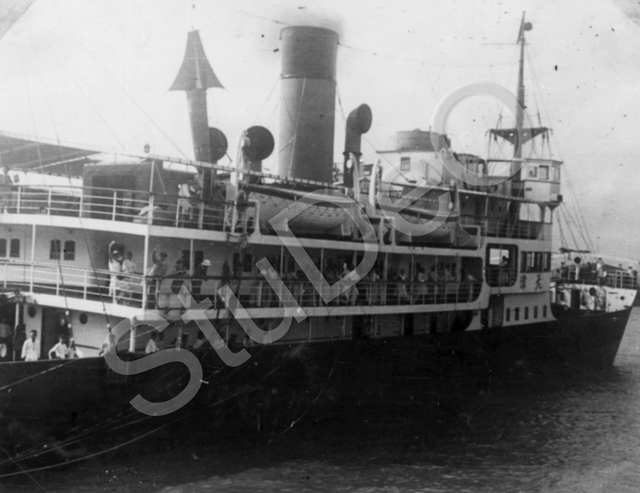 Beschreibung: Erika Simon-Eberhard winkt auf  Deck beim Ablegen des Dampfers nach Tsingtau.
