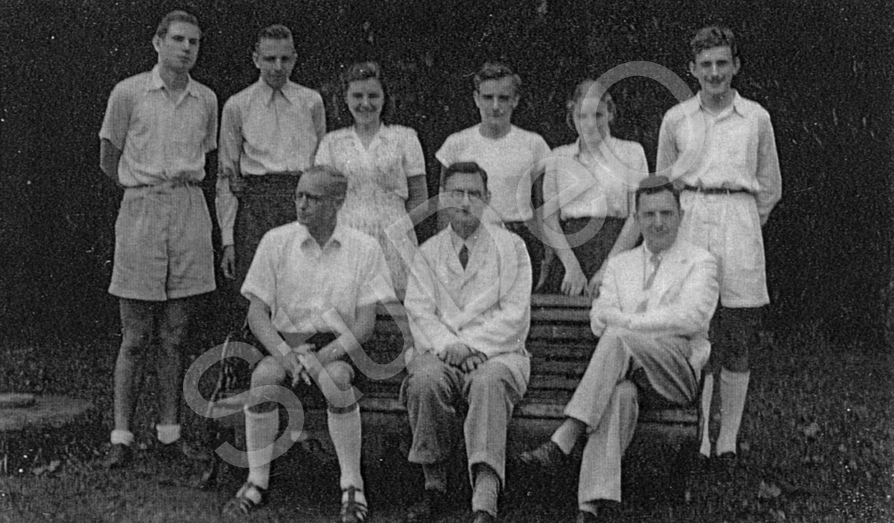 Beschreibung: v.li. Heinz Schulze, Jürgen Schwarzenburg, Gisela Bürklin, Hans-Heinz Tröger, Emanuela Mayer, Hans Steffens. Sitzend die Lehrer v.li.: Anton Amann (englisch, Französisch, Latein), Dr. Wilhelm Liedtke (Mathemat., Physik) und Heinrich Döring (Geographie, Geschichte).