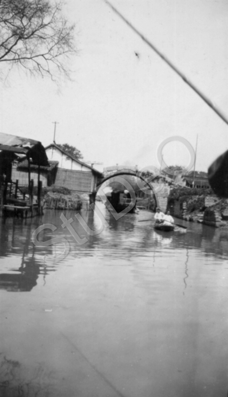 Beschreibung: Bogen-Brücke und Pfahlhäuser auf der „Tour von Nanyiang nach Piating“.