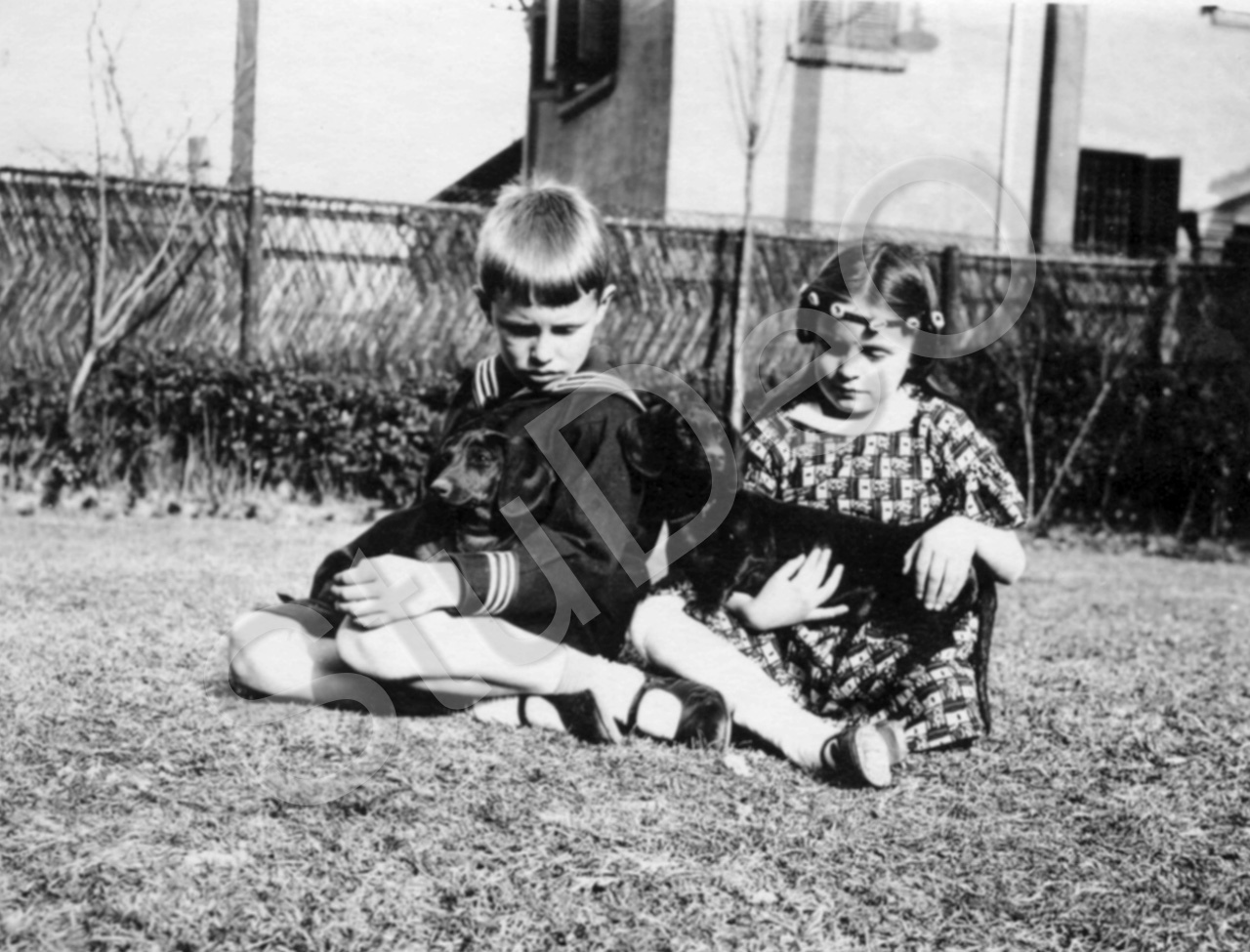 Beschreibung: Herbert und Ursel Thiel sitzen im Garten und haben je einen Dackel auf dem Schoß.