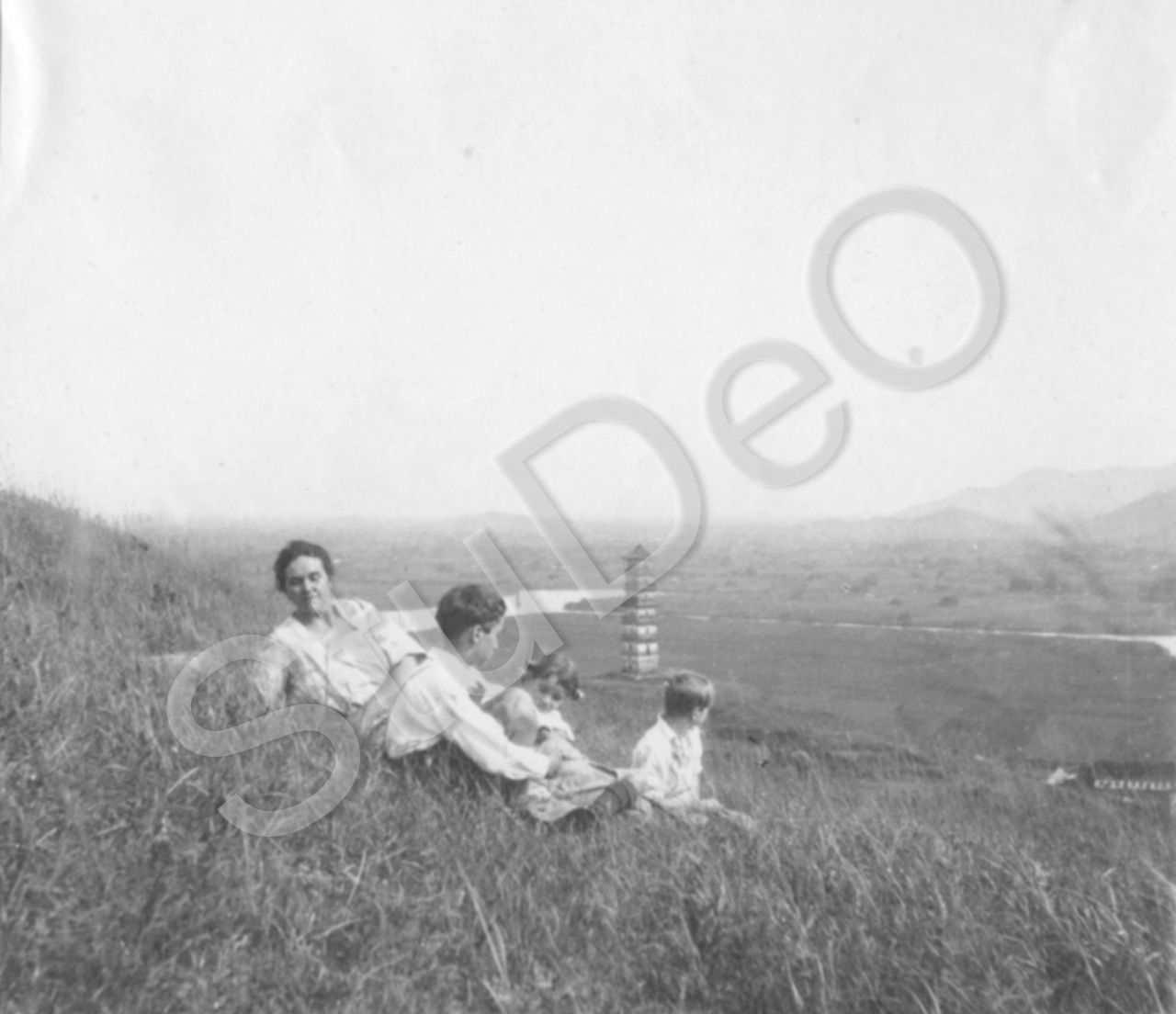 Beschreibung:  Helene Gerngroß mit ihren drei Kindern am Berghang bei Suchow. 7-8- stöckige Pagode im Flachland.